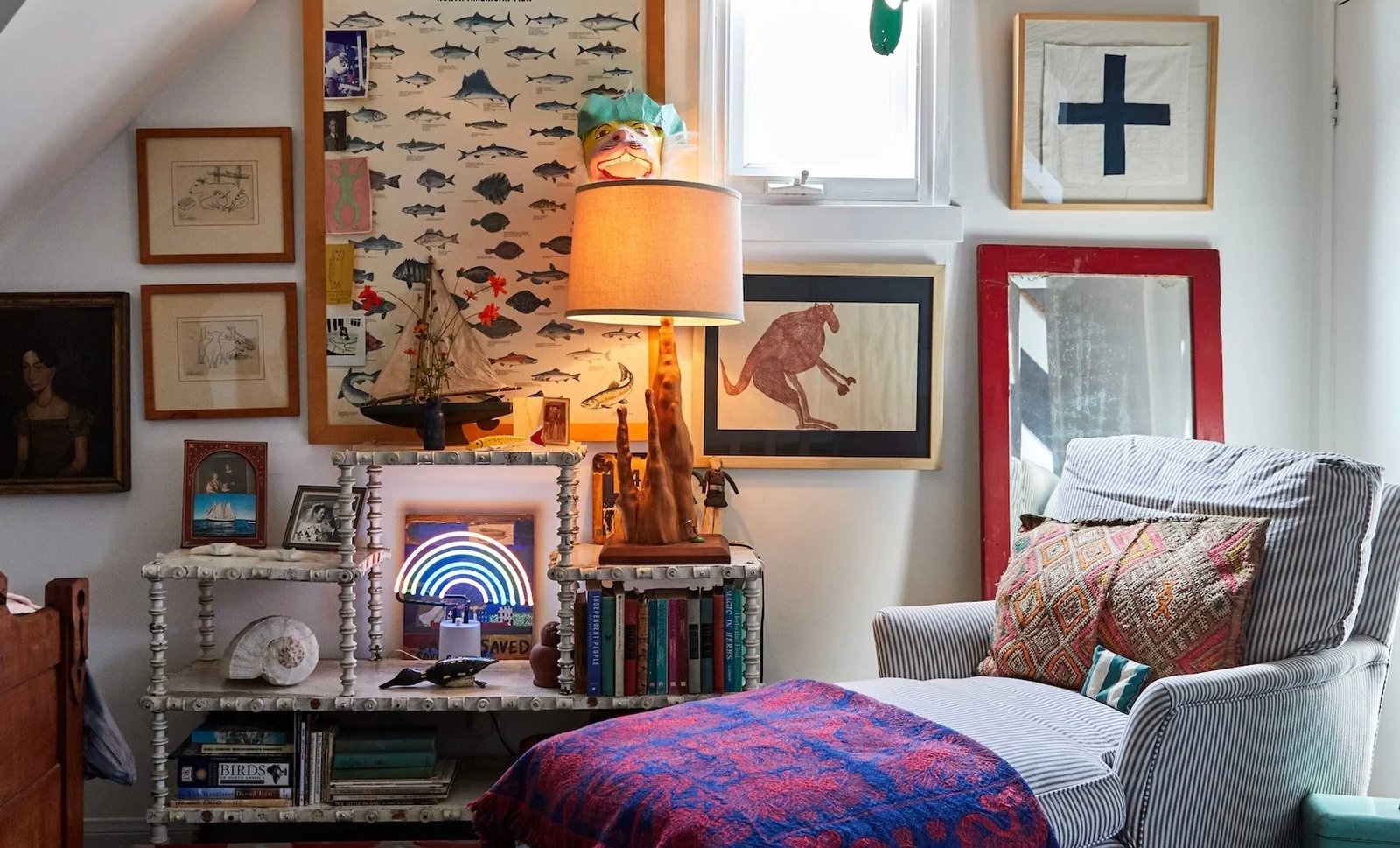 Caitlin Wylde lives with her dog, Rocket, on a woodsy street in Echo Park, Los Angeles. Though she’s been a Californian for over 30 years, her New England upbringing still echoes throughout her home with family heirlooms and nautical accents. Here, Caitlin gives us a tour, with photos by Leela Cyd… On a great leap: Before I moved here, I was in a relationship, and even though I knew we weren’t the right fit, we’d started looking at houses together. The relationship ended, and two weeks later, I saw this house for sale on a bulletin board in a bakery. As soon as I walked in the door, I was like, ‘Oh my god. This is my house.’ I decided I was going to take the leap. And it ended up being the best leap I ever took. LIVING ROOM Wall paint: Sydney Harbour Paint Co. On being a New Englander: I grew up by the sea in Massachusetts — surrounded by nature, roaming in the woods — and New England still has a big influence on my taste and my work as an artist. I once did a series of hand-stitched banners made from old boat flags, which was bananas, because they’re so huge. On durable art: The circles on the table are actually an art piece of mine. Kids really seem to like them. They go right for them, and throw them around. But I let them — they’re sturdy! On vignettes: I love to make clusters of things around the house. I’ve been doing it since I was a kid — collecting objects from outside and arranging them together, almost like they’re talking to one another. I’m always trying to pare down and put things away, but I just end up making another little scene. I can’t help it. KITCHEN Wall paint: Benjamin Moore Simply White. On a connection: I spotted this French poster at an auction house here in L.A. I was born in the Year of the Rooster, so when I saw it was a rooster, I was immediately drawn to it. I told myself, ‘Okay, if the bidding doesn’t go too high, I can get it.’ And then of course, I was the only one who bid on it. On working with what you’ve got: The kitchen was not in great shape when I moved in, so I had to work to make it functional. Since it’s such a small space, I think of it like a boat kitchen. On a landline: We had a phone just like this in the kitchen when I was growing up, so I love having one in my own home. It was my actual landline for many years, and I finally just had the service turned off because the only people who still used that number were my mom’s old friends calling from back east, and they’d never remember the time difference! On calendars: I buy these calendars every year from a store in L.A. called Bunkado. They’re designed by the artist Hajime Okamoto, and every year it’s a different cat theme — this one was railway cats. The drawing of my dog, Rocket, was done by my friend’s daughter, Charlie, when she was four (she’s now 14). I love it so much. GUEST ROOM Wall paint: Benjamin Moore. Rainbow lamp: MoMA Design Store. On a playful space: My friends’ kids always end up hanging out in the guest room when they come over. So, it’s where I keep all the toys and stuffed animals and fun things. On a just-right bed: You know what’s wild? Before I moved here, I saw this bed. It belonged to a dear neighbor, who had an estate sale when his partner died. And I just loved the bed — it was so adorable. So, I got it, then my relationship ended, and then I wound up in this house. When I saw this nook, with the little triangle ceiling, I just knew that bed belonged there. It fit perfectly. On a green floor: When I moved in, these floorboards were just pine with shellac, and it was just — ugh. My solution was to just paint over with this dark green paint. And I’m so glad I did, because it makes me happy every time I look at it. BATHROOM Model ship: similar. On a special feature: All the wood in the bathroom is cedar. So, when you take a bath or steamy shower, the room smells so good. Cabinet paint: Fine Paints of Europe in Navy. “It’s Dutch door paint — it lasts forever!” Cup: Falcon. Clam shell bowl: similar. BEDROOM Wall paint: Benjamin Moore in Simply White. Bedding: Pietse. On red and white: I have a great love for red-and-white stripes. Growing up, my dad’s best friend was a classics professor who had to spend time in Greece. We were able to go there, and I have this memory of being four years old, standing on a beach, and seeing all these red-and-white beach balls. I was filled with awe. On a colorful collection: I love enamel lamps from the 60s and 70s. I get so pumped by the simple shapes, amazing colors, and utilitarian design. ART STUDIO On rituals: I’m an early morning person, and my ritual is to start the day by burning Japanese incense and playing dreamy music, like Brian Eno. Then I have a cup of tea. I like to sit and just be in the studio before I start work. On reflection: Right now, my old and new work is mixed together in the studio, as well as some of my parents’ artwork. It’s nice to look around and see the progression, how it all connects. Thank you so much for sharing your home with us, Caitlin! P.S. Many more home tours, including a book lover’s family home, a soft landing in Brooklyn, and a Minnesota house with the cutest dog/a>. (Photos by Leela Cyd.) 0 COMMENTS Source link
