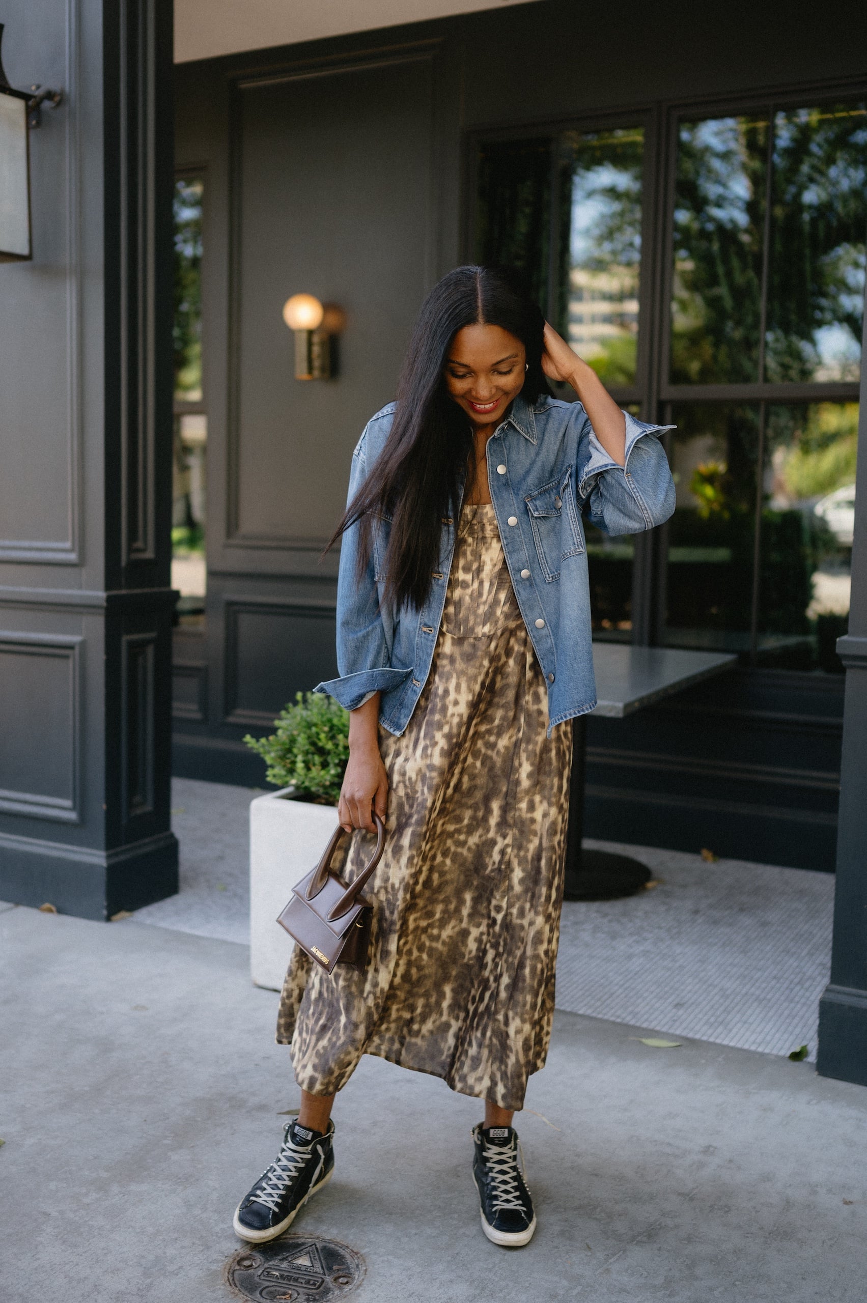 Denim shirt: Madewell, similar. Dress: Bardot, similar.